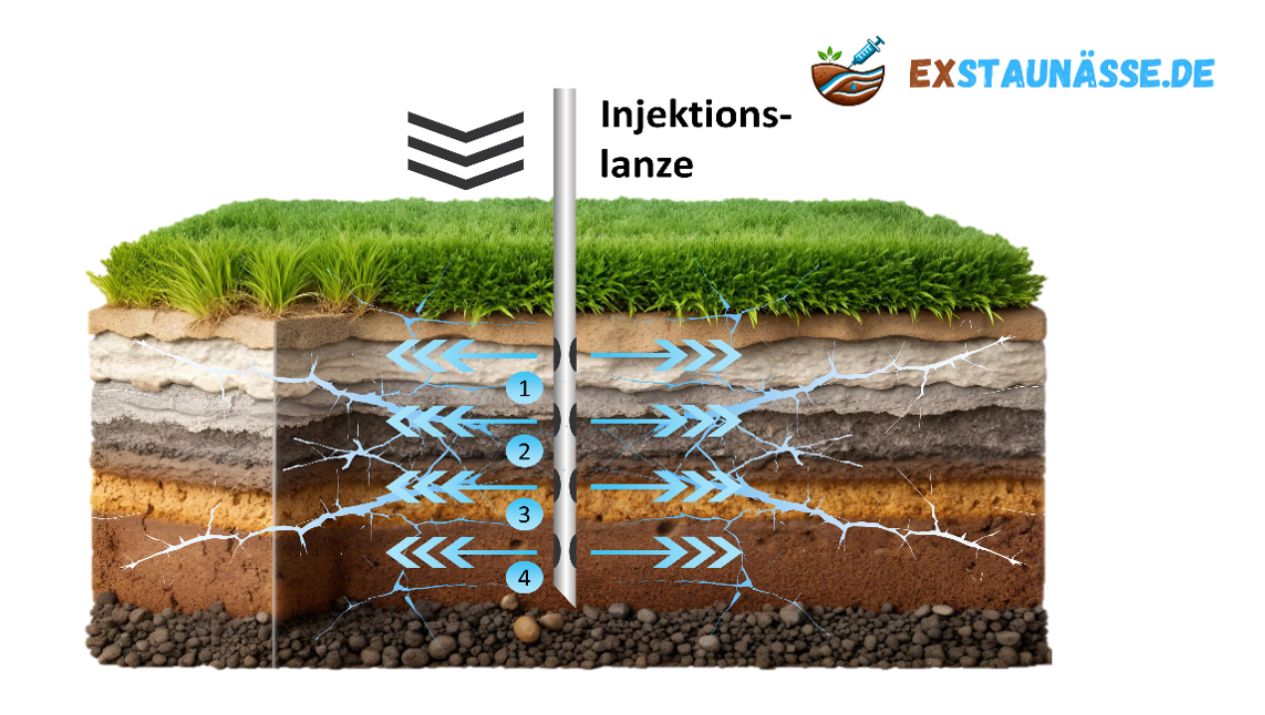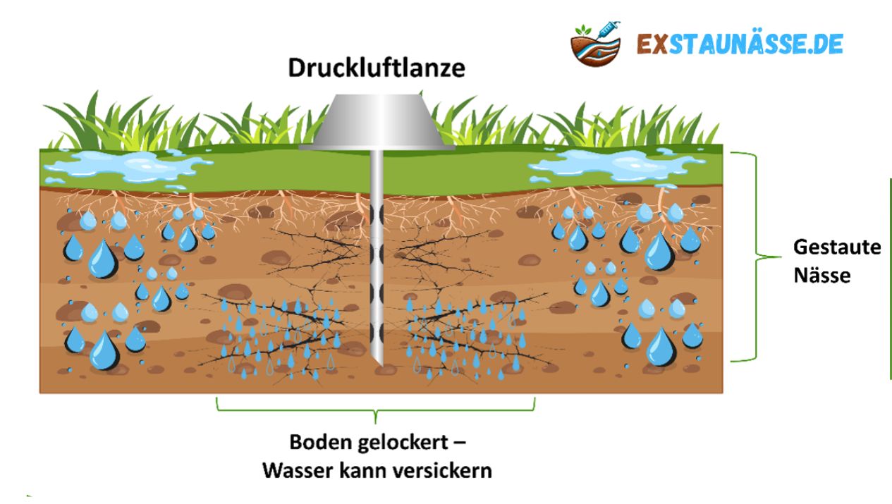 Die Injektionslanze wird in den Boden eingebracht, um durch gezielte Luftinjektionen den Boden zu lockern. Mit vier Injektionsstufen wird die Bodenstruktur durchbrochen und belüftet, wodurch Wasser, Nährstoffe und Luft besser zu den Wurzeln gelangen können.